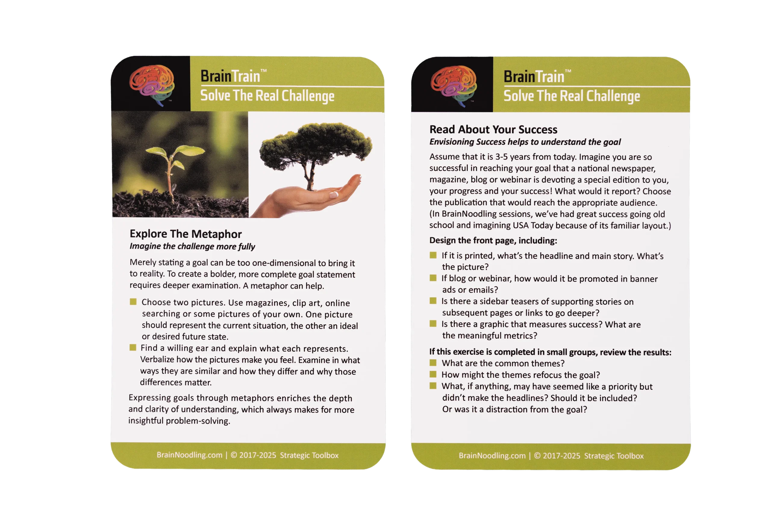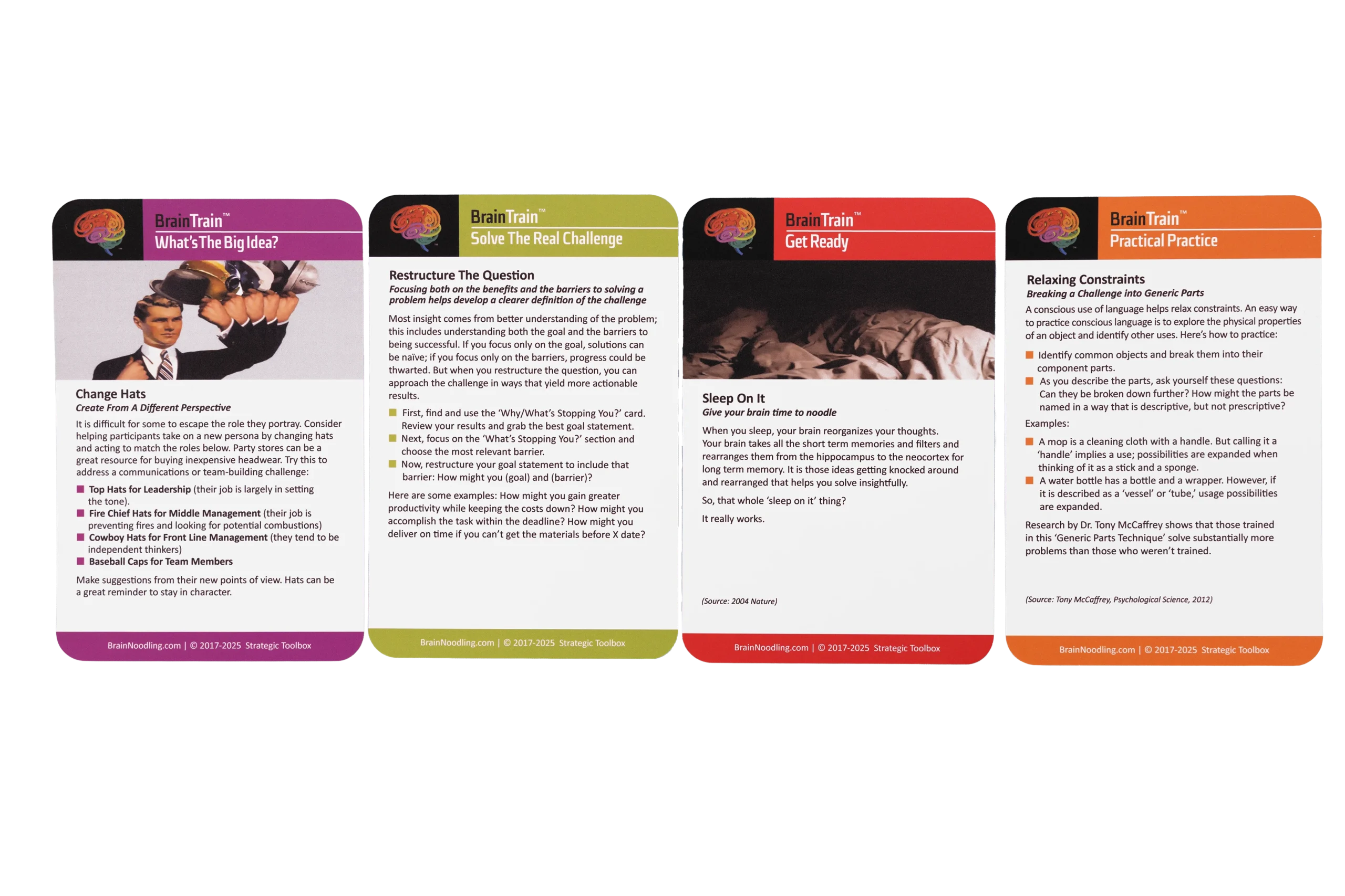 BrainTrain is a 40-card tool designed to help individuals and teams build the skills that lead to better insight — especially when a challenge calls for more than a quick fix.